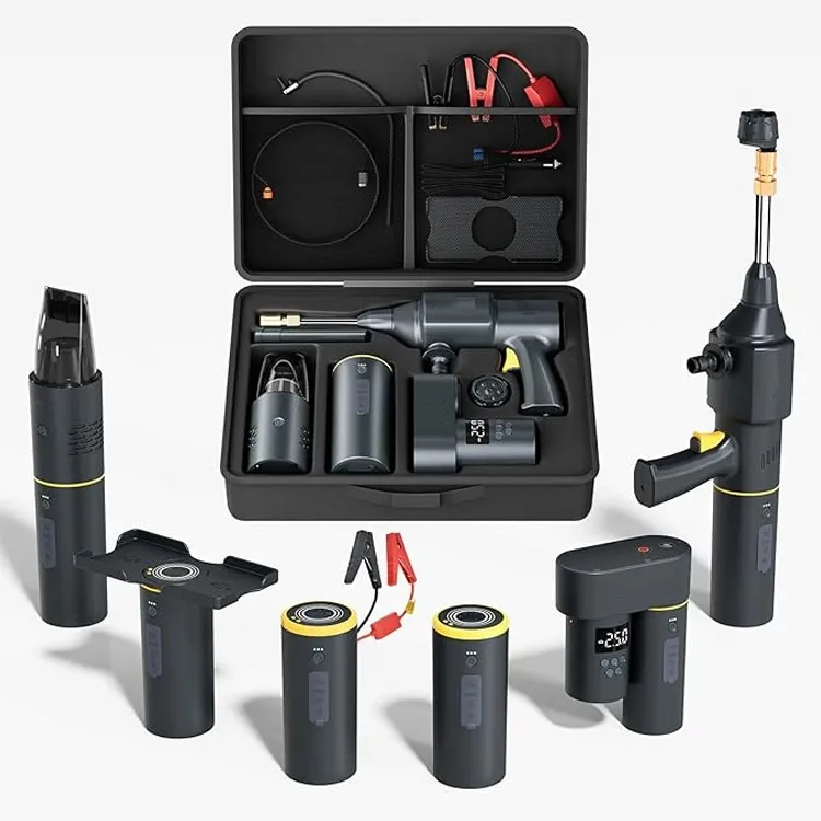 Купив цей комплект для подорожей — тепер завжди спокійний. Компресор працює чудово, підкачує шини за кілька хвилин, пилосос реально чистить, не просто для вигляду. Дуже зручно, що всі модулі на одному акумуляторі — не треба носити купу зарядок. Кейс якісний, усе компактно складається. Рекомендую кожному автомобілісту!